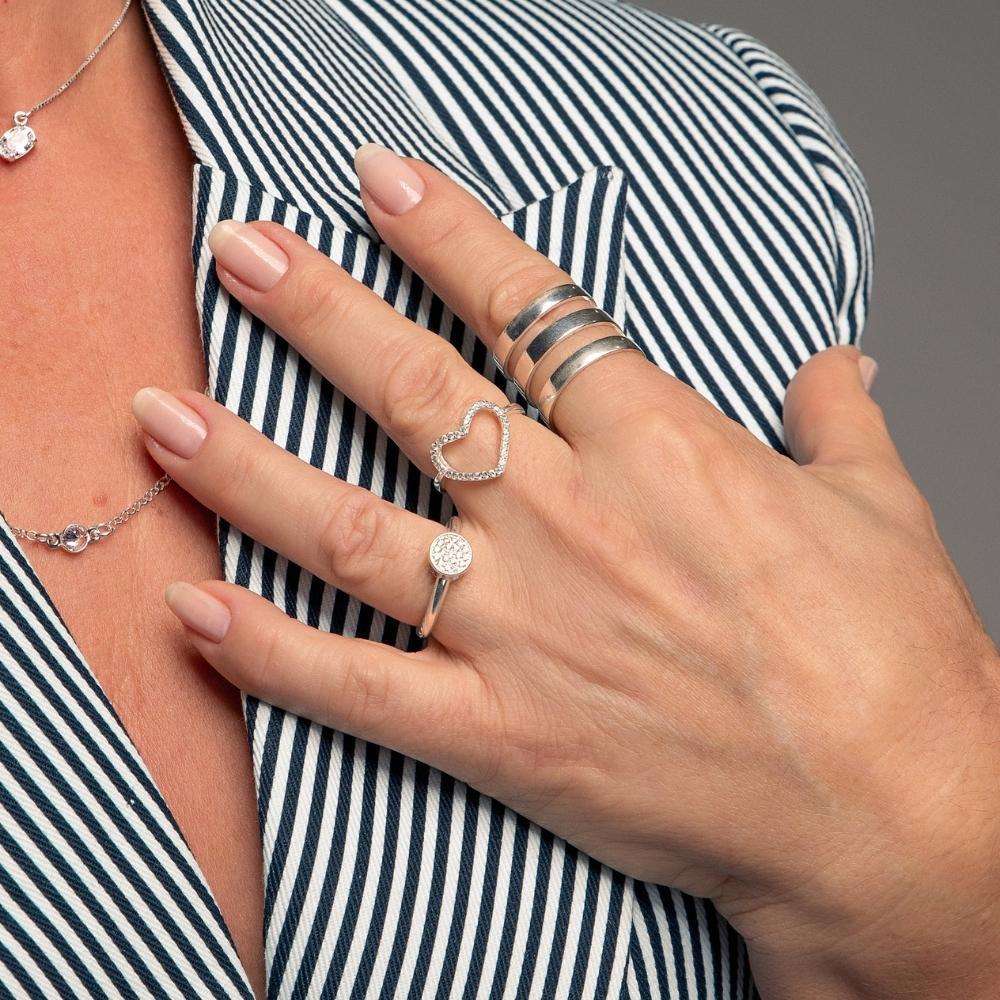 Confeccionado em prata clara com um coração vazado no topo todo cravejado com zircônias branca, é um anel completamente singular!