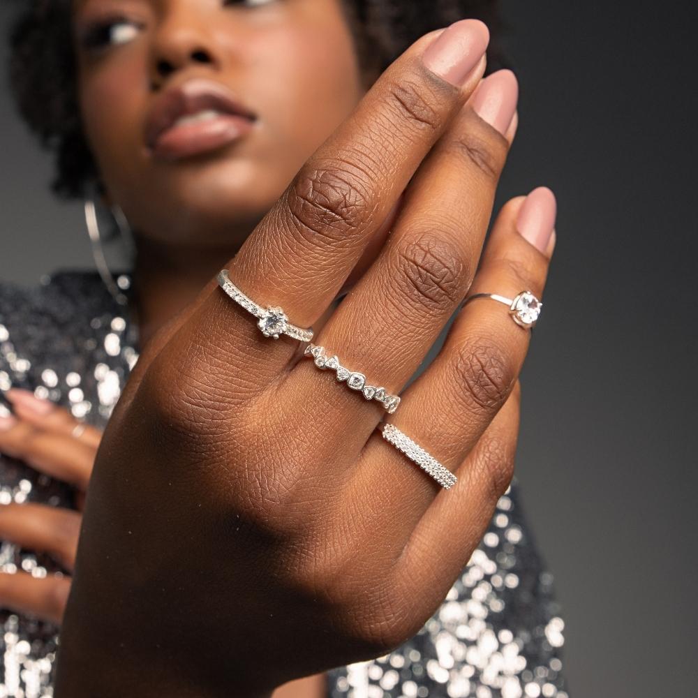 O anel de prata geométrico zircônias, sem dúvidas é o acessório ideal para embelezar suas mãos e trazer muito charme para qualquer look.
