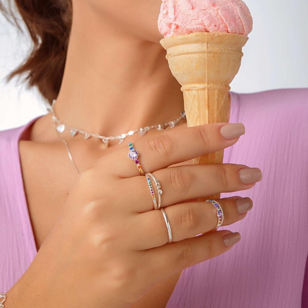 Os mixes de anéis são uma tendência e ficam maravilhosos quando feitos com anéis lisos ou geométricos e usa-se um anel de contraste como os de zircônia colorida. Além disso, os anéis de falange, ou ponta de dedo são perfeitos para finalizar seu mix!
