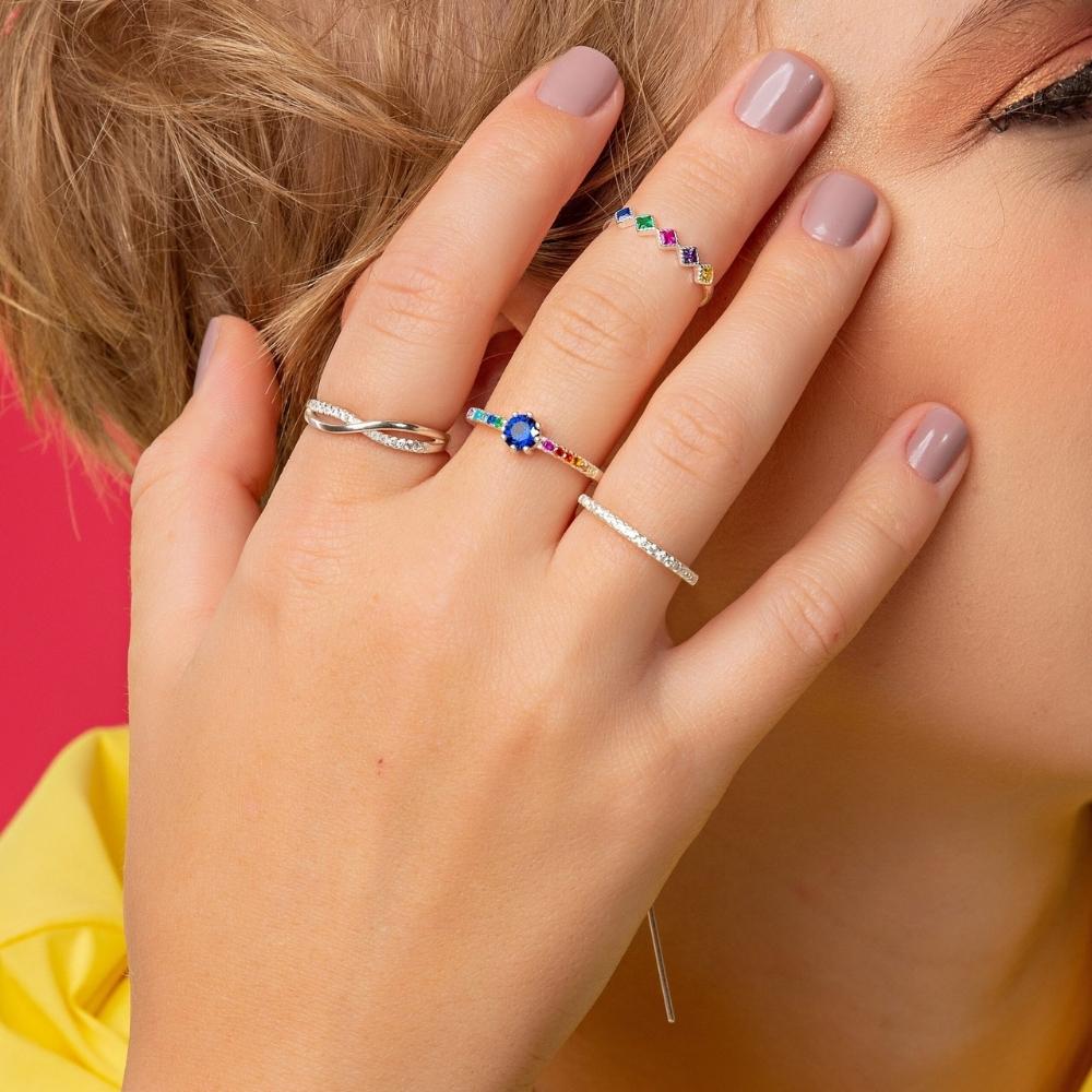 Os mixes de anéis são uma tendência e ficam maravilhosos quando feitos com anéis lisos ou geométricos e usa-se um anel de contraste como os de zircônia colorida. Além disso, os anéis de falange, ou ponta de dedo são perfeitos para finalizar seu mix!