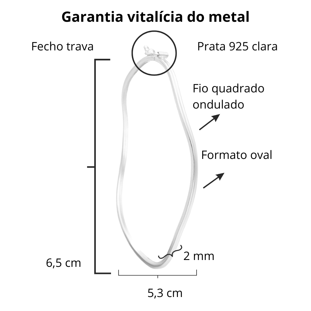 Com o propósito de trazer esse efeito, possui o formato oval ondulado com um delicado fecho trava, e fio quadrado ondulado em espessura fina de 2 mm. Um verdadeiro encanto.