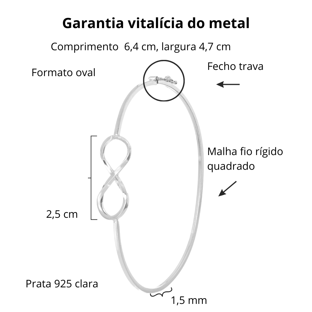 Este bracelete elegante é feito em prata 925 e possui um formato oval com um infinito vazado no centro, adicionando um toque moderno e sofisticado à peça.