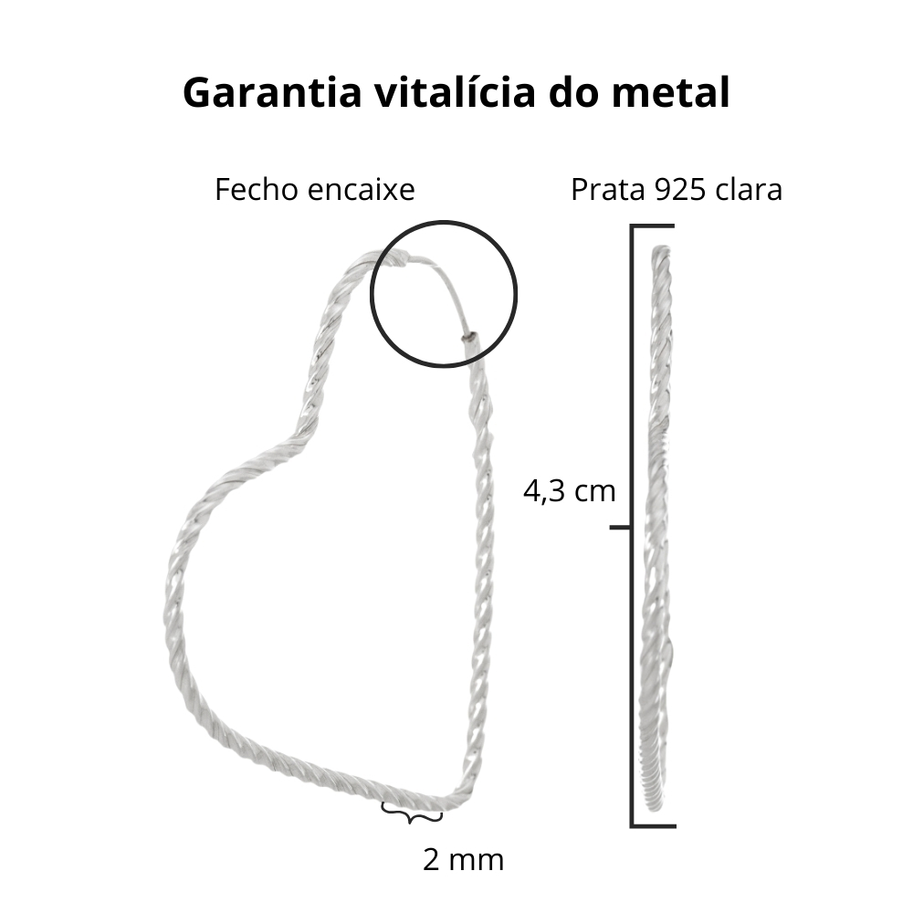 Brinco de prata 925 argola coração fio torcido 4,3 cm