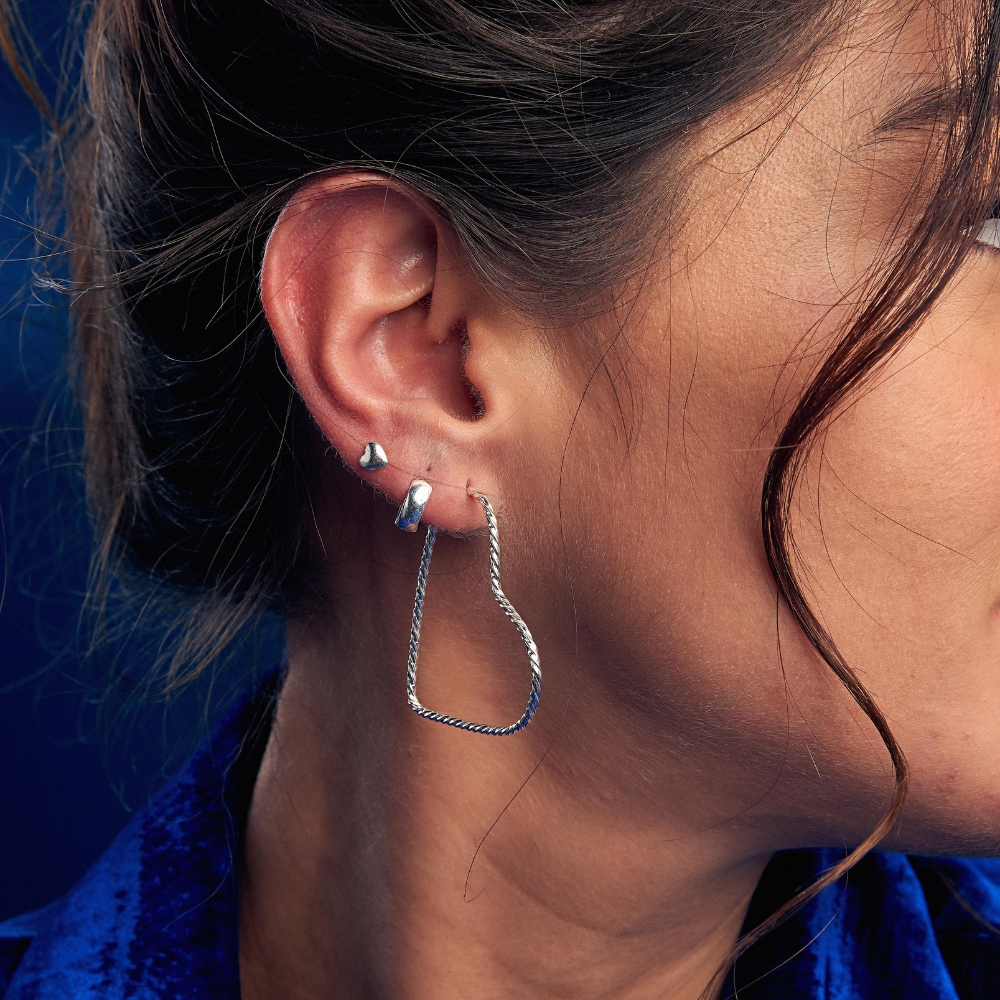 A argola de prata coração torcida M é muito versátil, afinal, pode ser usada para compor looks casuais e formais.