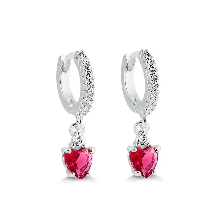 Brinco de prata 925 argola cravejada com pingente coração rubi