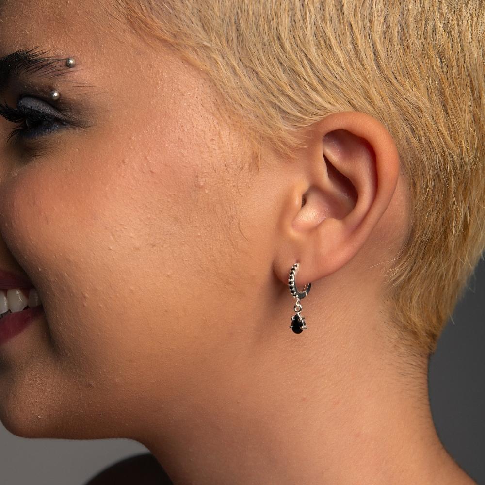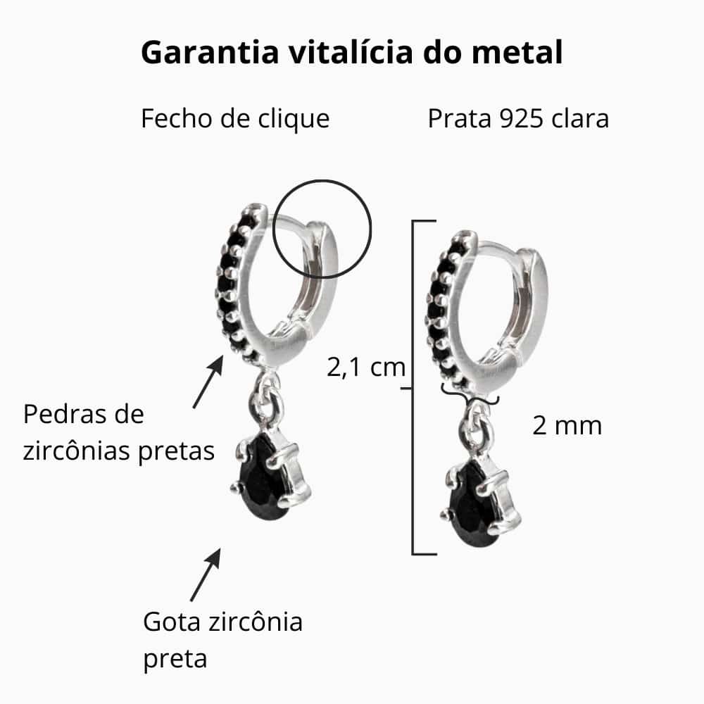 As pedrinhas de zircônias preta na argola dão um toque especial na joia. Enquanto o pingente com design de gota a torna única!