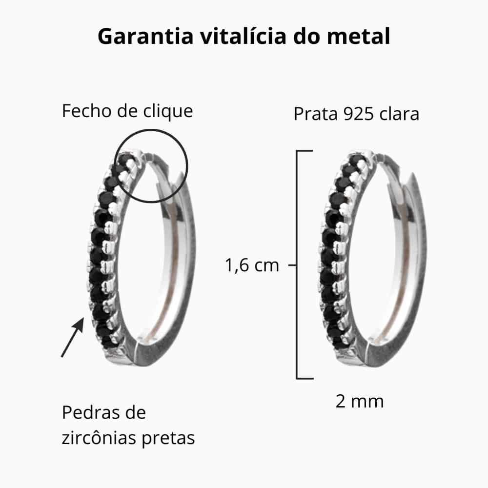 Brinco De Prata 925 Argola Fileira Zircônia Preta 1,6 cm