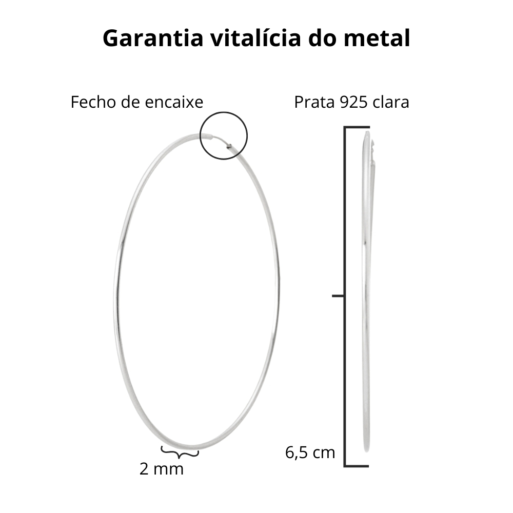 Confeccionado em prata clara tem o aro liso com 5 cm de diâmetro com 2 mm de espessura e o fecho de encaixe.