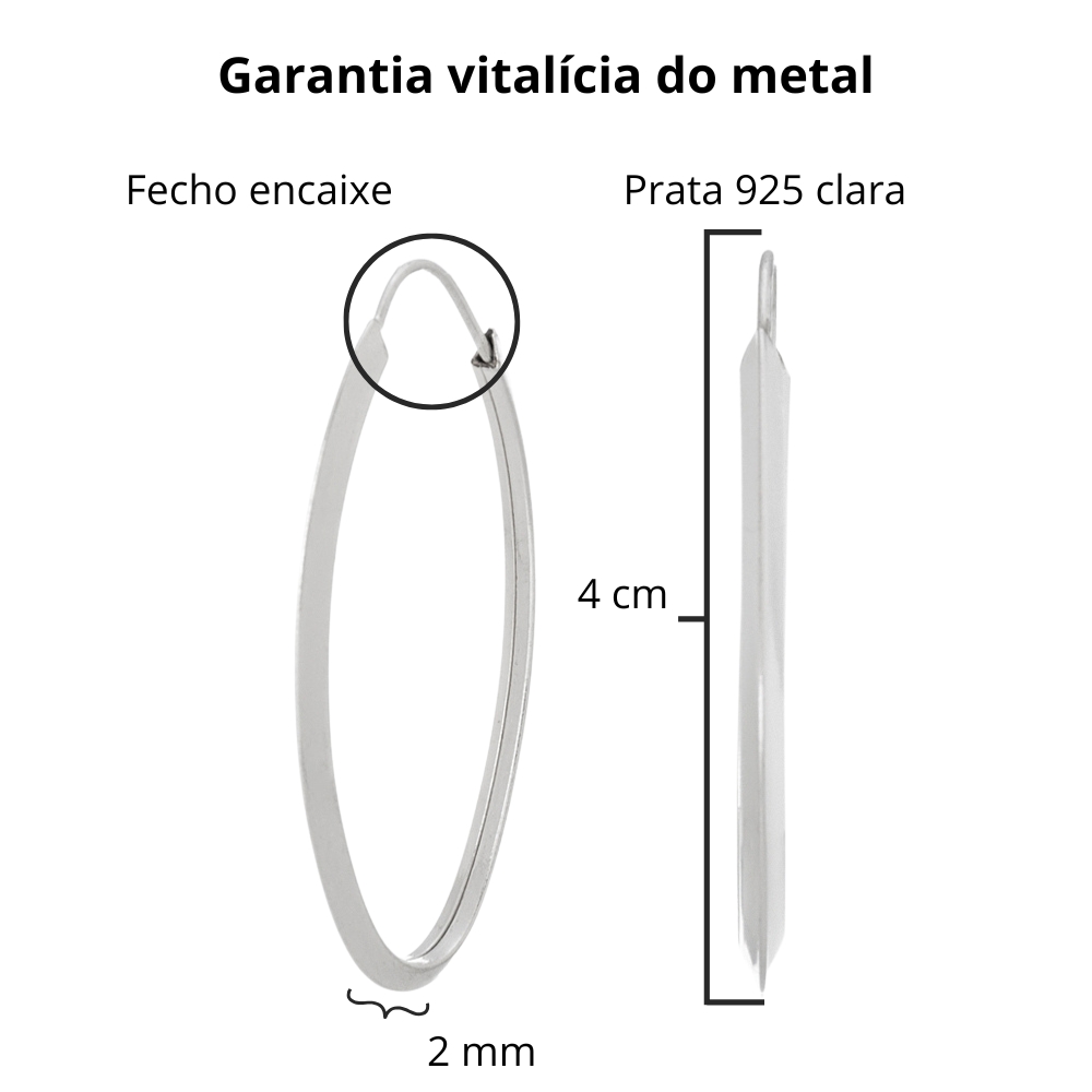 Confeccionado em prata clara tem o aro liso com fio triangular e formato oval pontiaguda com 4 cm de comprimento e o fecho de encaixe.