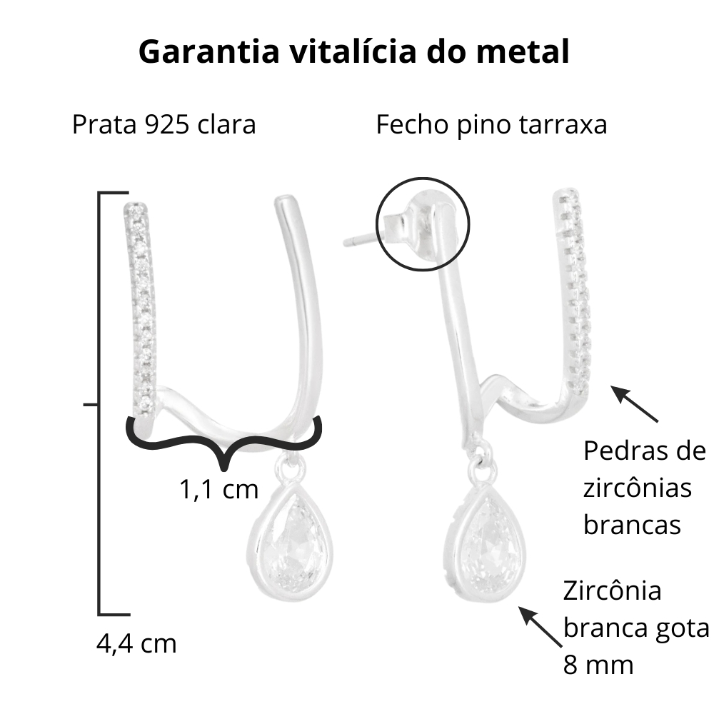 Brinco de prata 925 aro duplo cravejado e zircônia gota pendurada