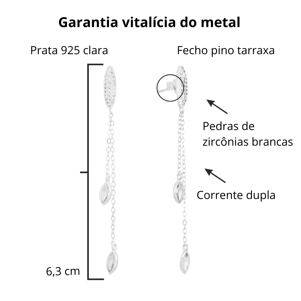 Brinco de prata 925 base oval cravejada com corrente dupla zircônias penduradas
