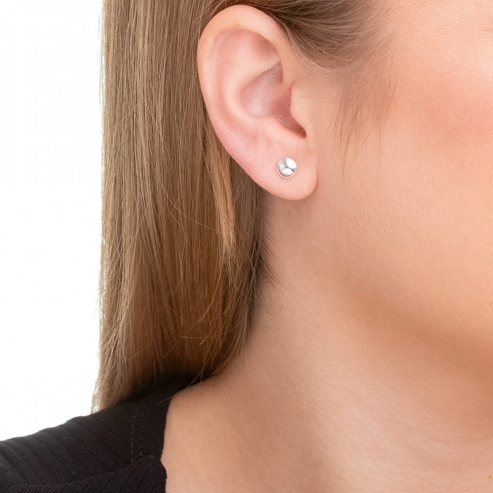 Fabricado em prata clara, este brinco possui um design elegante com sua forma de círculo abaulado, criando um efeito de meia bola.