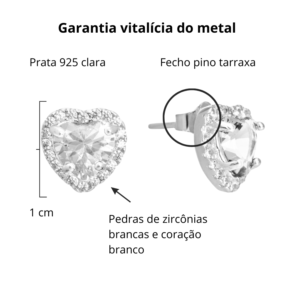 Brinco de prata 925 coração cristal com borda cravejada com zircônias