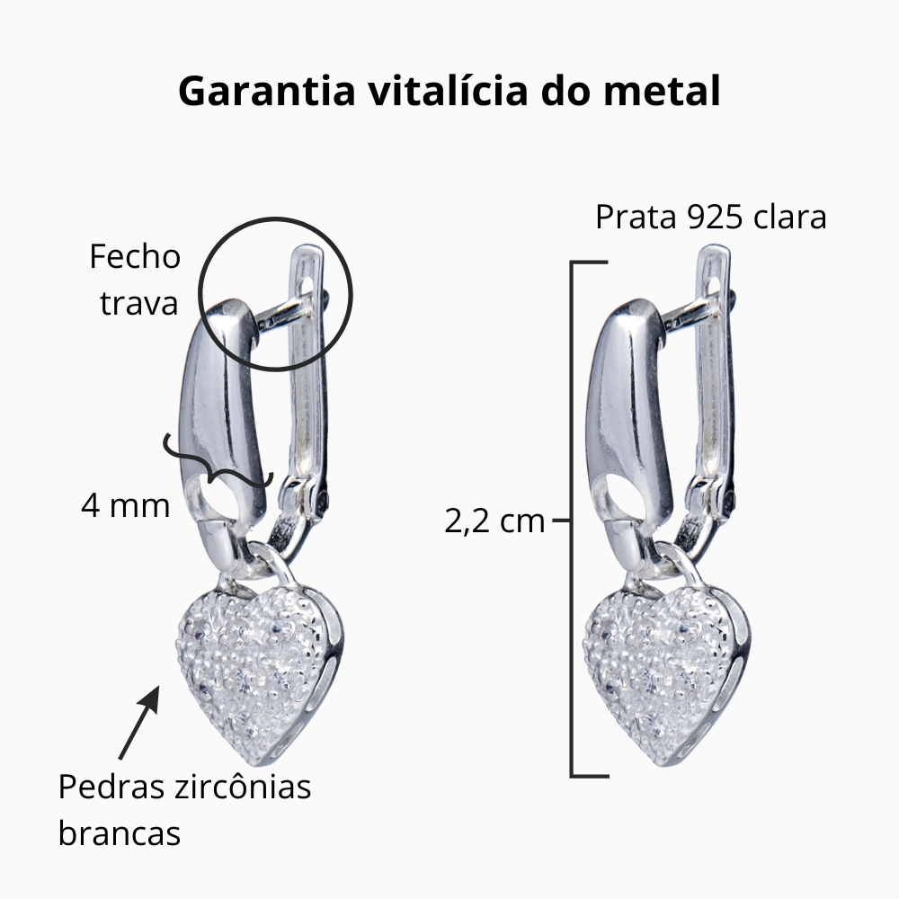 Brinco De Prata 925 Com Pingente Coração Cravejado 2 Cm