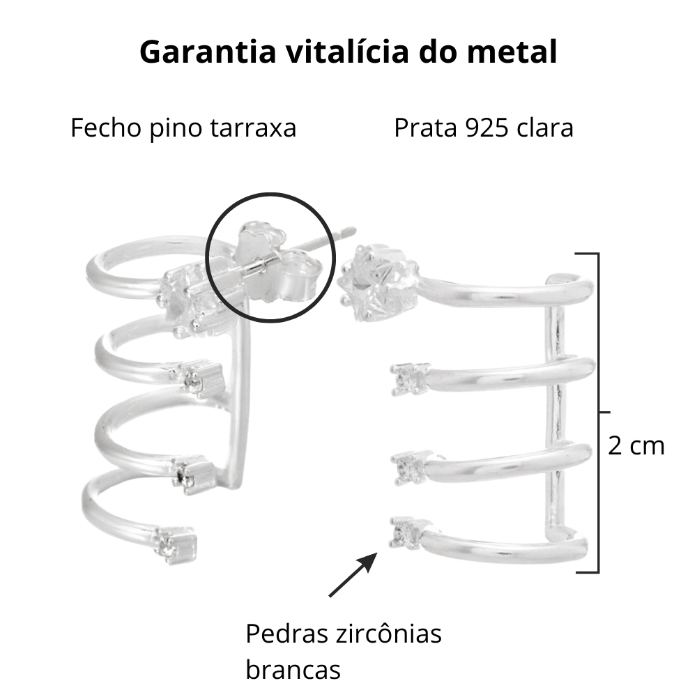 Brinco de prata 925 ear cuff quatro argolas e detalhes em zircônias com tarraxa 2 cm