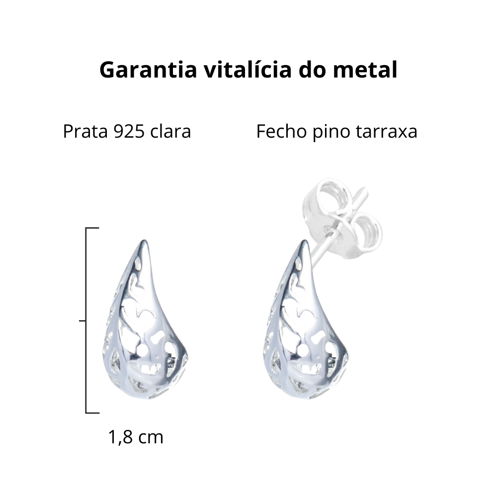 Feito em prata clara, o brinco gota vazada pequena Prata possui um sutil design em formato de gota trabalhada vazada e o fecho de tarraxa.