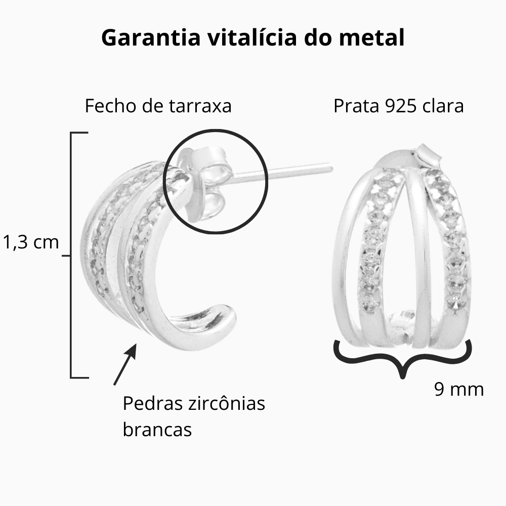 Além disso, na parte frontal, este brinco exibe um design refinado, com dois aros lisos nas laterais que abraçam um aro central cravejado de zircônias. Esse toque de brilho das zircônias adiciona um resplendor sutil e encantador ao brinco.