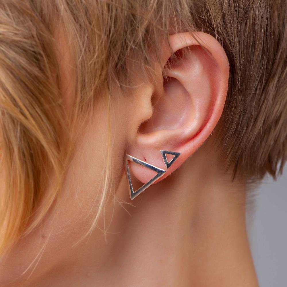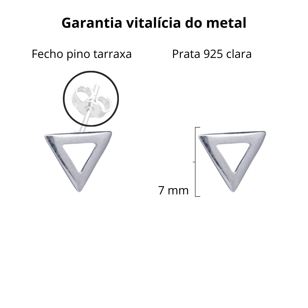 Feito em prata clara, possui o design de triângulo vazado e o fecho de tarraxa. É um verdadeiro arraso!