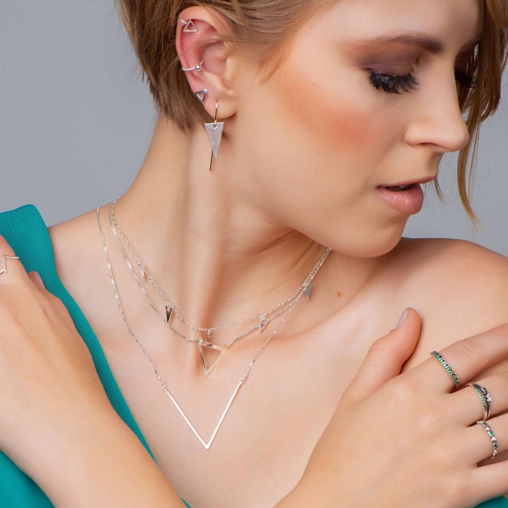 As formas geométricas nos acessórios estão sempre em alta e nos conquistando, assim como o brinco triângulo pequeno em Prata.
