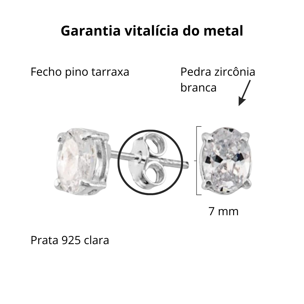Brinco De Prata 925 Zircônia Oval Cristal 7,0 mm