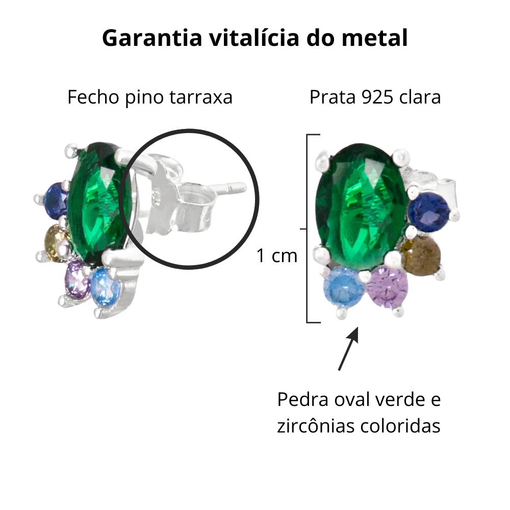Brinco de prata 925 zircônia oval verde com detalhes em zircônias coloridas 1,0 cm