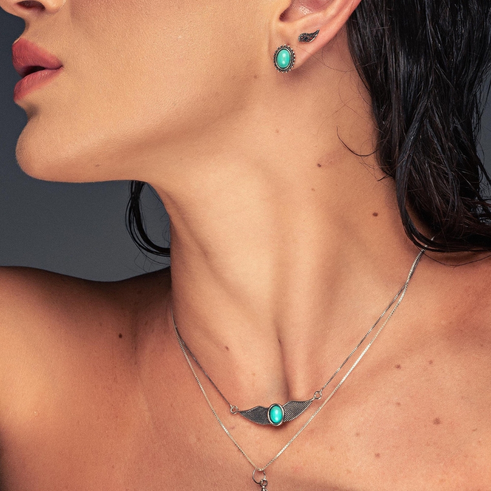 É feito na malha veneziana envelhecida com um pingente fixo em formato de asa. Ela é texturizada com uma pedra azul turquesa ao centro.