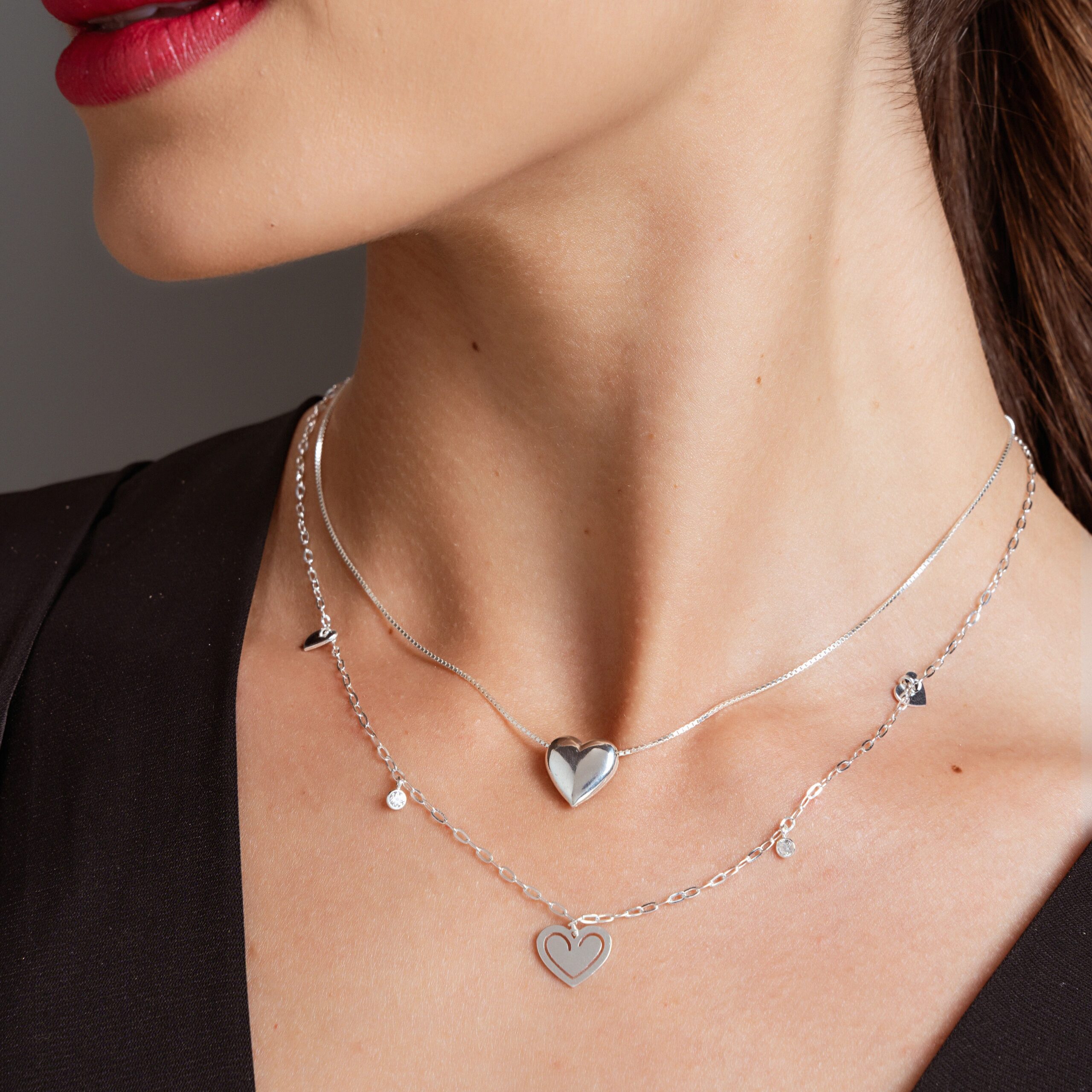 O Colar de Prata Coração com Pingentes é uma peça encantadora e delicada. Feito em prata, possui um pingente principal em formato de coração com um recorte vazado no centro, formando um coração menor.
