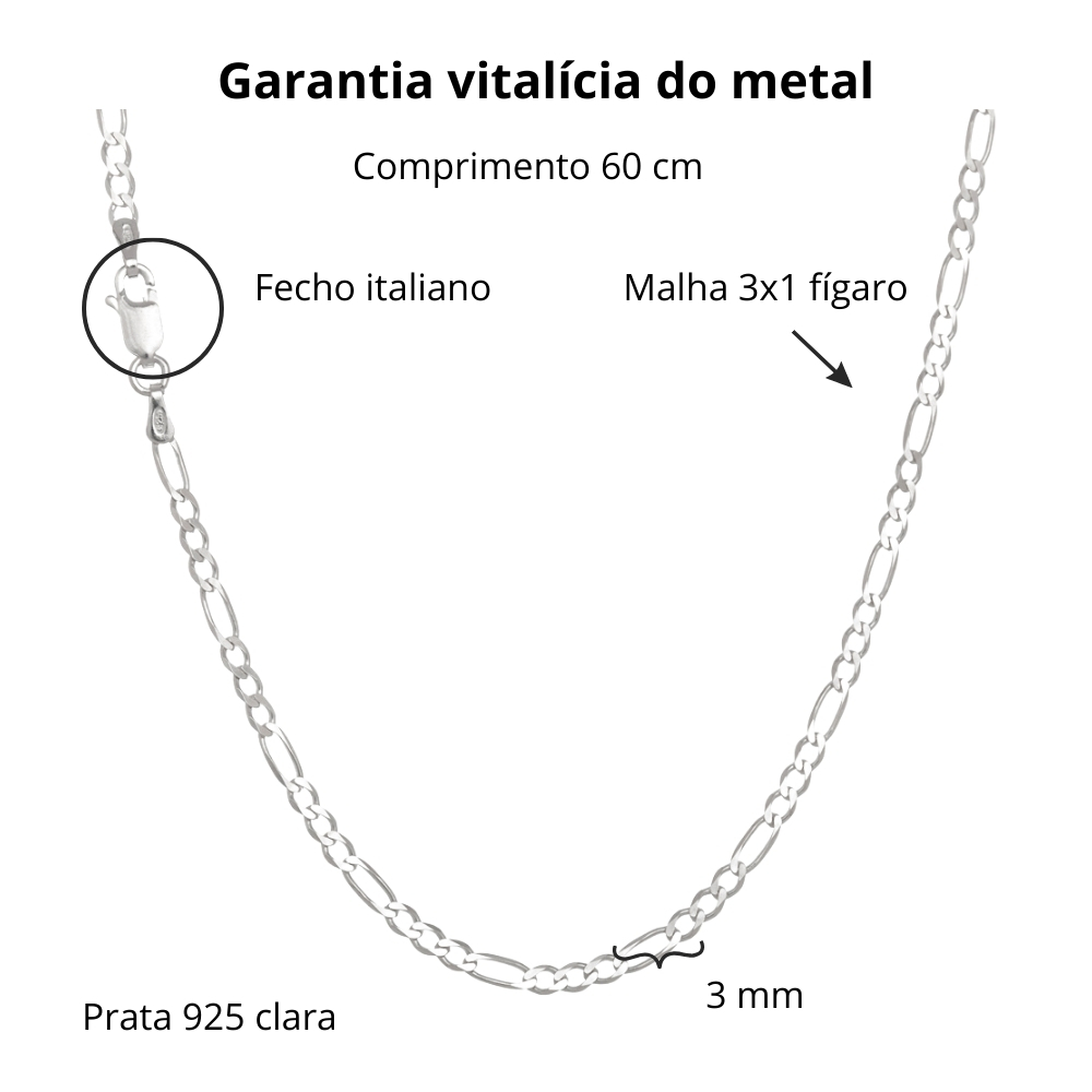 Feita com elos 3×1, também conhecidos como Fígaro, essa corrente de prata lisa garante um visual marcante e moderno. O fecho italiano proporciona segurança extra, ideal para o uso diário.