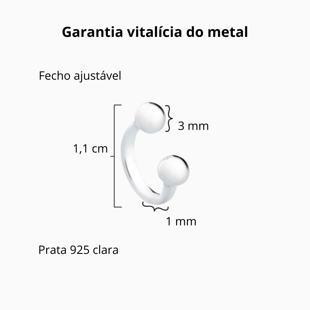 O piercing é feito em Prata lisa e possui um design delicado, com uma bolinha em cada extremidade. Como resultado, combina com todos os looks.